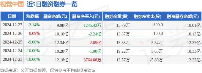 视觉中国融资融券信息显示,融资方面,当日融资买入3.45亿元,融资偿还3.57亿元,融资净偿还1245.42万元。融券方面,融券卖出300.0股,融券偿还1100.0股,融券余量13.79万股,融券余额308.48万元。融资融券余额10.01亿元。