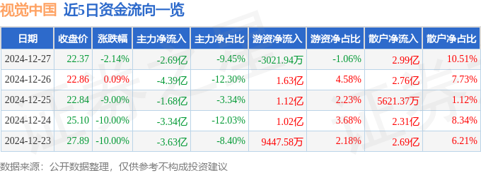 12月27日的资金流向数据方面,主力资金净流出2.69亿元,占总成交额9.45%,游资资金净流出3021.94万元,占总成交额1.06%,散户资金净流入2.99亿元,占总成交额10.51%。