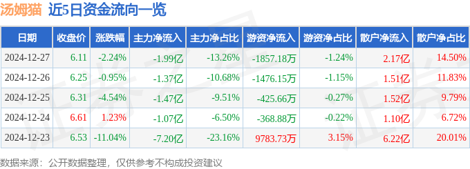 截至2024年12月27日收盘,汤姆猫(300459)报收于6.11元,下跌2.24%,换手率7.59%,成交量240.6万手,成交额14.99亿元。