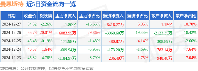 截至2024年12月27日收盘,曼恩斯特(301325)报收于54.52元,下跌2.26%,换手率31.49%,成交量18.23万手,成交额10.78亿元。