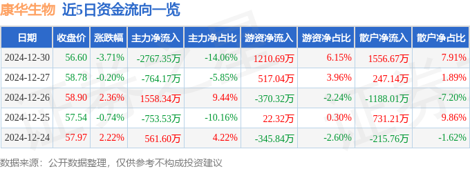 截至2024年12月30日收盘,康华生物(300841)报收于56.6元,下跌3.71%,换手率2.85%,成交量3.43万手,成交额1.97亿元。