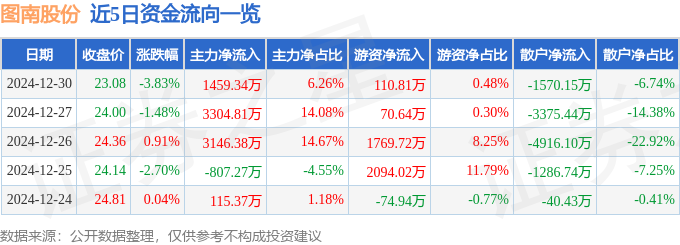 截至2024年12月30日收盘,图南股份(300855)报收于23.08元,下跌3.83%,换手率3.41%,成交量10.0万手,成交额2.33亿元。