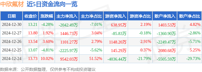 截至2024年12月30日收盘,中欣氟材(002915)报收于13.21元,下跌4.28%,换手率7.59%,成交量21.9万手,成交额2.91亿元。