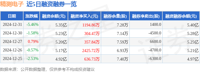精测电子融资融券信息显示,融资方面,当日融资买入5072.09万元,融资偿还3877.23万元,融资净买入1194.86万元,连续3日净买入累计1857.16万元。融券方面,融券卖出2800.0股,融券偿还1400.0股,融券余量7.28万股,融券余额468.1万元。融资融券余额5.4亿元。