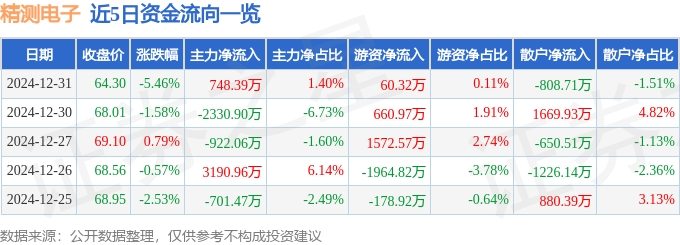 截至2024年12月31日收盘,精测电子(300567)报收于64.3元,下跌5.46%,换手率4.04%,成交量8.2万手,成交额5.35亿元。