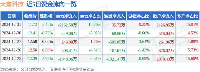 12月31日的资金流向数据方面,主力资金净流出2162.58万元,占总成交额15.26%,游资资金净流入35.72万元,占总成交额0.25%,散户资金净流入2126.85万元,占总成交额15.01%。