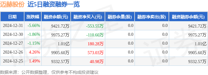迈赫股份融资融券信息显示,融资方面,当日融资买入616.59万元,融资偿还1170.15万元,融资净偿还553.55万元。融券方面,融券卖出0.0股,融券偿还0.0股,融券余量0.0股,融券余额0.0万元。融资融券余额9421.72万元。