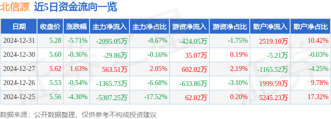 截至2024年12月31日收盘,北信源(300352)报收于5.28元,下跌5.71%,换手率3.65%,成交量44.59万手,成交额2.42亿元。