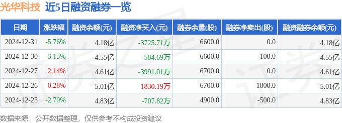 光华科技融资融券信息显示,融资方面,当日融资买入3157.9万元,融资偿还6883.61万元,融资净偿还3725.71万元。融券方面,融券卖出0.0股,融券偿还0.0股,融券余量6600.0股,融券余额10.9万元。融资融券余额4.18亿元。