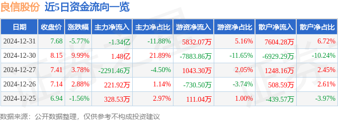 12月31日的资金流向数据方面,主力资金净流出1.34亿元,占总成交额11.88%,游资资金净流入5832.07万元,占总成交额5.16%,散户资金净流入7604.28万元,占总成交额6.72%。