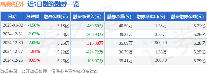 截至2025年1月2日收盘,高德红外(002414)报收于7.09元,下跌4.58%,换手率0.93%,成交量31.56万手,成交额2.28亿元。
