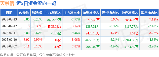 2月13日的资金流向数据方面,主力资金净流出8602.37万元,占总成交额7.77%,游资资金净流入718.3万元,占总成交额0.65%,散户资金净流入7884.08万元,占总成交额7.12%。