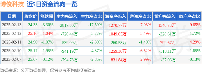 截至2025年2月13日收盘,博俊科技(300926)报收于24.33元,下跌3.3%,换手率2.29%,成交量6.49万手,成交额1.6亿元。