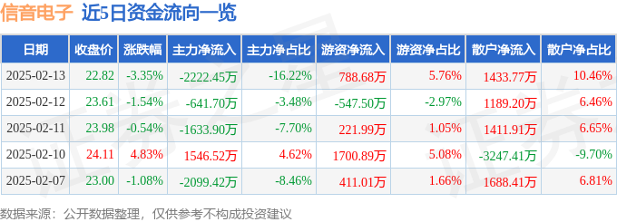 截至2025年2月13日收盘,信音电子(301329)报收于22.82元,下跌3.35%,换手率9.93%,成交量5.95万手,成交额1.37亿元。