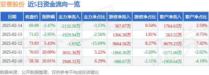 截至2025年2月14日收盘,亚香股份(301220)报收于69.88元,下跌2.47%,换手率20.94%,成交量9.86万手,成交额6.81亿元。