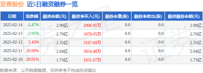 亚香股份融资融券信息显示,融资方面,当日融资买入9155.79万元,融资偿还7148.88万元,融资净买入2006.91万元,连续3日净买入累计8652.65万元。融券方面,融券卖出0.0股,融券偿还0.0股,融券余量0.0股,融券余额0.0万元。融资融券余额2.9亿元。