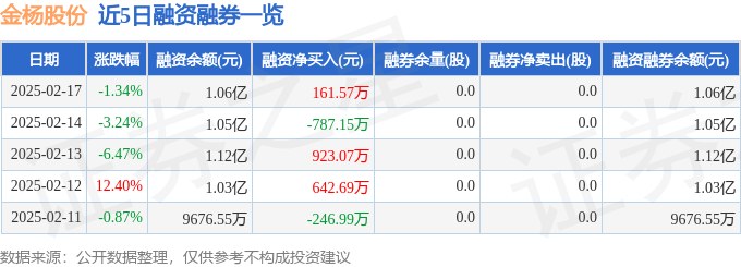金杨股份融资融券信息显示,融资方面,当日融资买入619.86万元,融资偿还458.28万元,融资净买入161.57万元。融券方面,融券卖出0.0股,融券偿还0.0股,融券余量0.0股,融券余额0.0万元。融资融券余额1.06亿元。