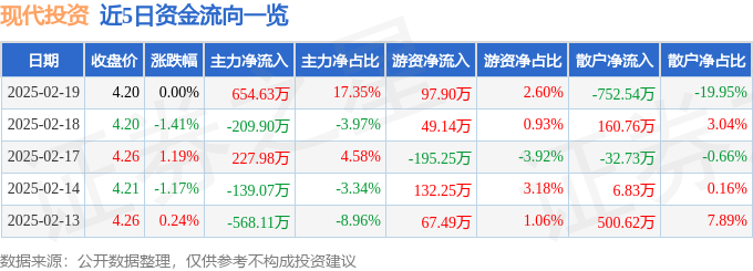 截至2025年2月19日收盘,现代投资(000900)报收于4.2元,上涨0.0%,换手率0.59%,成交量8.99万手,成交额3772.13万元。