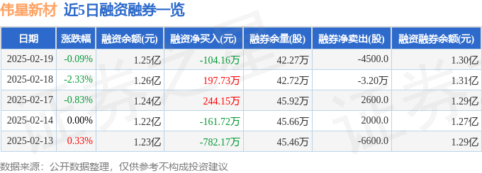 伟星新材融资融券信息显示,融资方面,当日融资买入291.07万元,融资偿还395.23万元,融资净偿还104.16万元。融券方面,融券卖出100.0股,融券偿还4600.0股,融券余量42.27万股,融券余额494.98万元。融资融券余额1.3亿元。