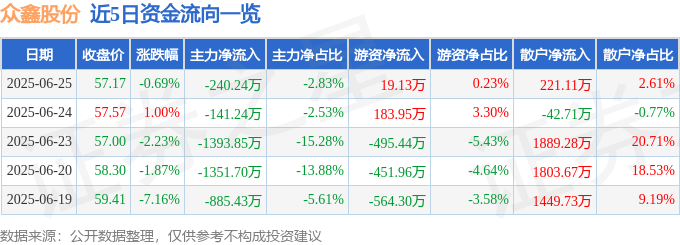 截至2025年6月25日收盘,众鑫股份(603091)报收于57.17元,下跌0.69%,换手率7.28%,成交量1.49万手,成交额8478.84万元。