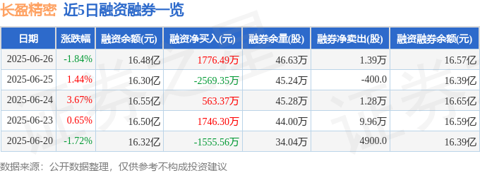 长盈精密融资融券信息显示,融资方面,当日融资买入1.04亿元,融资偿还8672.64万元,融资净买入1776.49万元。融券方面,融券卖出1.86万股,融券偿还4700.0股,融券余量46.63万股,融券余额969.44万元。融资融券余额16.57亿元。
