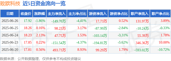 截至2025年6月26日收盘,致欧科技(301376)报收于17.92元,下跌1.86%,换手率0.97%,成交量1.88万手,成交额3396.03万元。