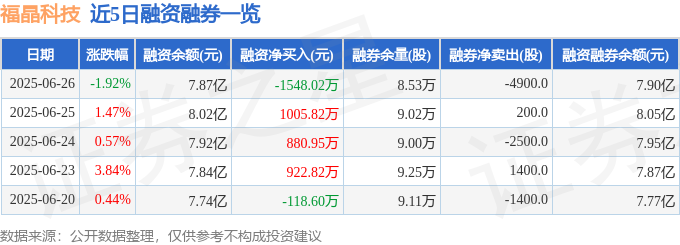 福晶科技融资融券信息显示,融资方面,当日融资买入3267.02万元,融资偿还4815.04万元,融资净偿还1548.02万元。融券方面,融券卖出600.0股,融券偿还5500.0股,融券余量8.53万股,融券余额283.88万元。融资融券余额7.9亿元。