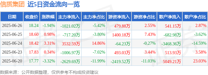 截至2025年6月26日收盘,信质集团(002664)报收于18.24元,下跌1.94%,换手率2.52%,成交量10.13万手,成交额1.88亿元。