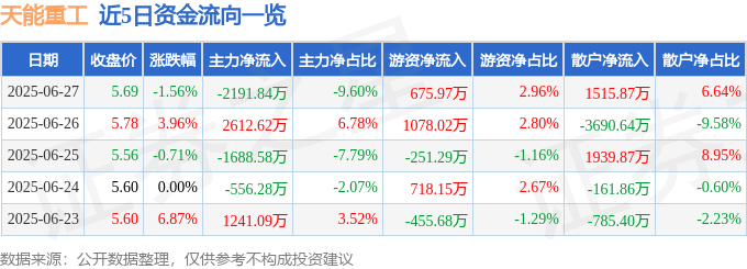 截至2025年6月27日收盘,天能重工(300569)报收于5.69元,下跌1.56%,换手率3.92%,成交量39.9万手,成交额2.28亿元。