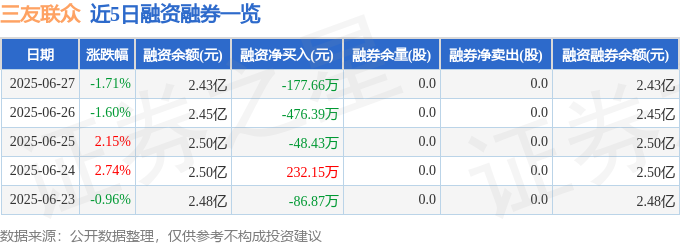 三友联众融资融券信息显示,融资方面,当日融资买入1542.15万元,融资偿还1719.8万元,融资净偿还177.66万元。融券方面,融券卖出0.0股,融券偿还0.0股,融券余量0.0股,融券余额0.0万元。融资融券余额2.43亿元。
