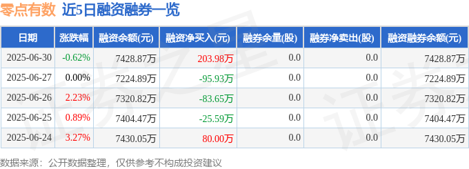 零点有数融资融券信息显示,融资方面,当日融资买入694.11万元,融资偿还490.14万元,融资净买入203.98万元。融券方面,融券卖出0.0股,融券偿还0.0股,融券余量0.0股,融券余额0.0万元。融资融券余额7428.87万元。