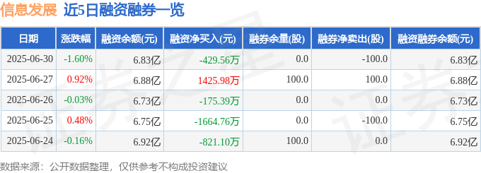 信息发展融资融券信息显示,融资方面,当日融资买入2425.18万元,融资偿还2854.74万元,融资净偿还429.56万元。融券方面,融券卖出0.0股,融券偿还100.0股,融券余量0.0股,融券余额0.0万元。融资融券余额6.83亿元。