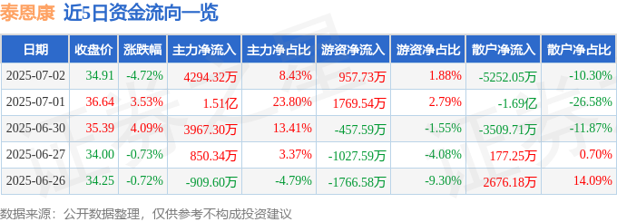 截至2025年7月2日收盘,泰恩康(301263)报收于34.91元,下跌4.72%,换手率4.69%,成交量14.23万手,成交额5.1亿元。