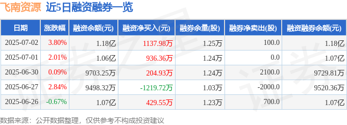 飞南资源融资融券信息显示,融资方面,当日融资买入3187.37万元,融资偿还2049.38万元,融资净买入1137.98万元,连续3日净买入累计2279.27万元。融券方面,融券卖出300.0股,融券偿还200.0股,融券余量1.25万股,融券余额28.35万元。融资融券余额1.18亿元。