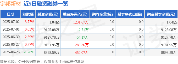 宇邦新材融资融券信息显示,融资方面,当日融资买入3417.17万元,融资偿还2185.49万元,融资净买入1231.67万元。融券方面,融券卖出0.0股,融券偿还0.0股,融券余量0.0股,融券余额0.0万元。融资融券余额1.04亿元。