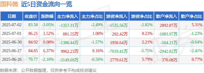 截至2025年7月2日收盘,国科微(300672)报收于83.58元,下跌3.05%,换手率3.09%,成交量6.49万手,成交额5.45亿元。
