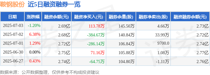 鞍钢股份融资融券信息显示,融资方面,当日融资买入1154.4万元,融资偿还1040.62万元,融资净买入113.78万元。融券方面,融券卖出11.73万股,融券偿还7.07万股,融券余量145.5万股,融券余额359.37万元。融资融券余额2.73亿元。
