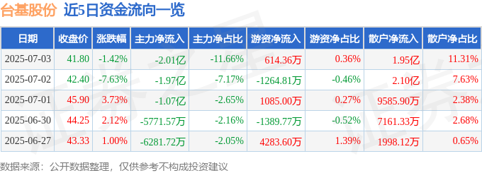 截至2025年7月3日收盘,台基股份(300046)报收于41.8元,下跌1.42%,换手率17.39%,成交量41.13万手,成交额17.23亿元。
