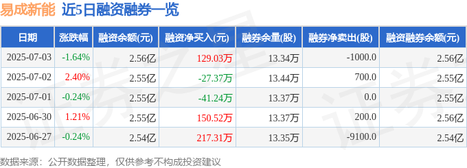 易成新能融资融券信息显示,融资方面,当日融资买入809.39万元,融资偿还680.36万元,融资净买入129.03万元。融券方面,融券卖出0.0股,融券偿还1000.0股,融券余量13.34万股,融券余额56.03万元。融资融券余额2.56亿元。