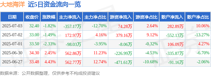 截至2025年7月3日收盘,大地海洋(301068)报收于32.4元,下跌1.82%,换手率0.86%,成交量8622.0手,成交额2811.53万元。