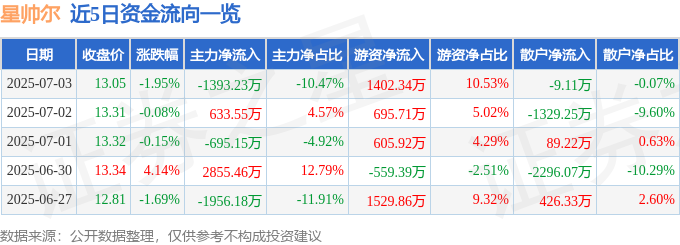 截至2025年7月3日收盘,星帅尔(002860)报收于13.05元,下跌1.95%,换手率2.9%,成交量10.15万手,成交额1.33亿元。