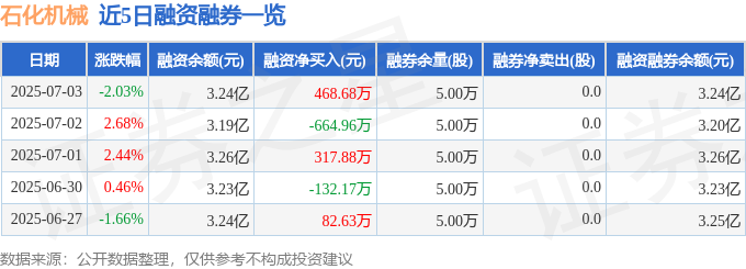 石化机械融资融券信息显示,融资方面,当日融资买入3063.94万元,融资偿还2595.25万元,融资净买入468.68万元。融券方面,融券卖出0.0股,融券偿还0.0股,融券余量5.0万股,融券余额33.8万元。融资融券余额3.24亿元。