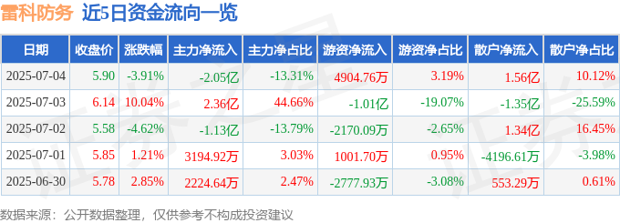 截至2025年7月4日收盘,雷科防务(002413)报收于5.9元,下跌3.91%,换手率20.66%,成交量255.88万手,成交额15.39亿元。