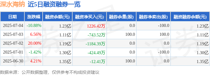 深水海纳融资融券信息显示,融资方面,当日融资买入6943.47万元,融资偿还5717.04万元,融资净买入1226.42万元。融券方面,融券卖出0.0股,融券偿还100.0股,融券余量0.0股,融券余额0.0万元。融资融券余额1.23亿元。
