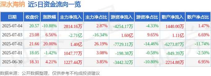 截至2025年7月4日收盘,深水海纳(300961)报收于20.57元,下跌10.88%,换手率30.35%,成交量46.1万手,成交额9.82亿元。