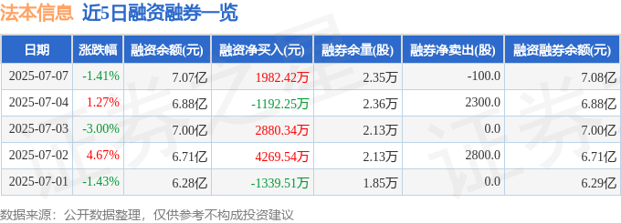 法本信息融资融券信息显示,融资方面,当日融资买入1.08亿元,融资偿还8866.2万元,融资净买入1982.42万元。融券方面,融券卖出0.0股,融券偿还100.0股,融券余量2.35万股,融券余额59.13万元。融资融券余额7.08亿元。