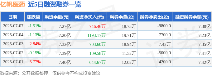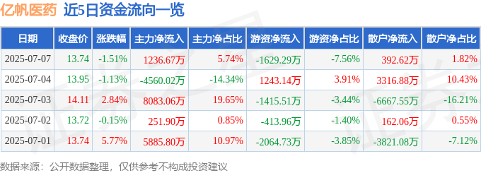 截至2025年7月7日收盘,亿帆医药(002019)报收于13.74元,下跌1.51%,换手率1.85%,成交量15.55万手,成交额2.16亿元。