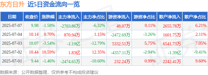 截至2025年7月7日收盘,东方日升(300118)报收于9.98元,下跌1.58%,换手率4.61%,成交量42.76万手,成交额4.28亿元。
