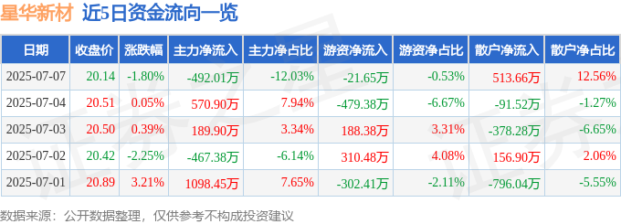 截至2025年7月7日收盘,星华新材(301077)报收于20.14元,下跌1.8%,换手率2.13%,成交量2.02万手,成交额4089.0万元。