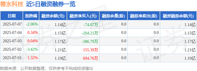 善水科技融资融券信息显示,融资方面,当日融资买入687.72万元,融资偿还761.78万元,融资净偿还74.07万元。融券方面,融券卖出0.0股,融券偿还0.0股,融券余量0.0股,融券余额0.0万元。融资融券余额1.14亿元。